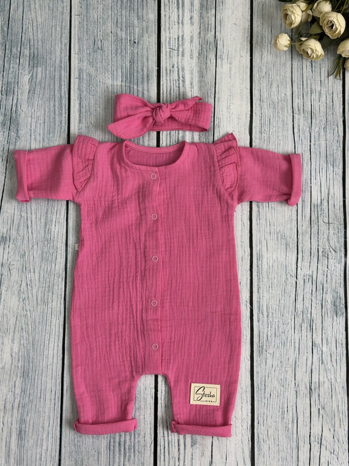 Теги: Купить оптом детский комбинезон . 336-Ф. Комбинезон с повязкой для девочки из муслина, хлопок 100%, размеры 56,62,68, фуксия цена,отзывы официальный сайт "Стеша Брянск"